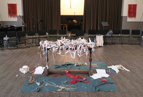 Patricia Fong led this grief braid ritual at the summer 2024 Ekklesia Gathering in Monrovia, CA as well as a regional Ekklesia Gathering in San Francisco in November 2024. Participants were asked to bring objects gathered from precarious places in their neighborhoods, especially places damaged by capitalism and climate change, and objects related to people or places they are mourning. They were asked to pay particular attention to borderlands, to garbage, to discarded materials they might otherwise ignore. These objects were braided into second-hand fabric sourced from Monrovia, CA as a part of the grief braid ritual. Participants received this guide: